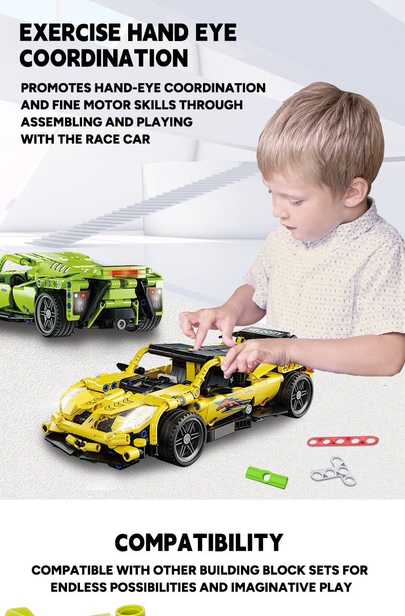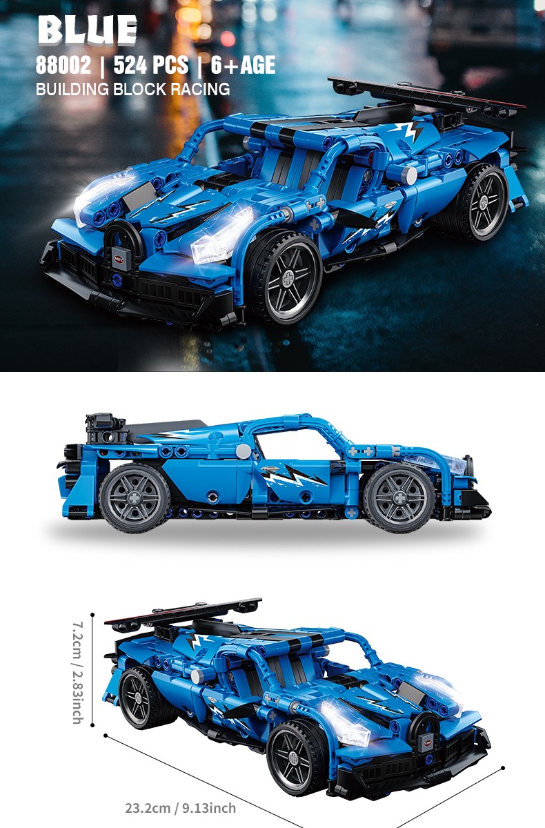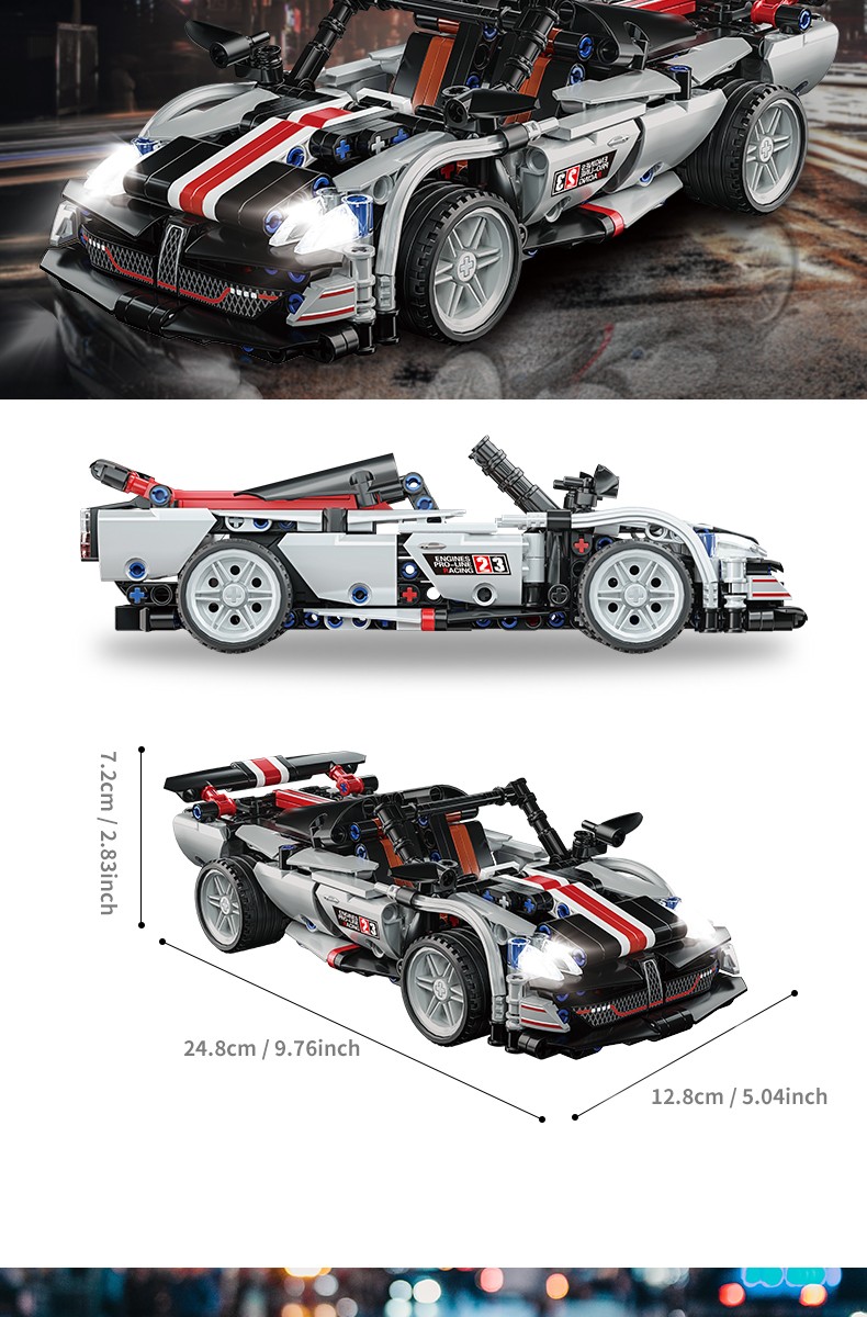 小颗粒跑车积木套装,精美造型回力跑车,仿真还原跑车的炫酷外观,具有回力功能、模拟静态车灯(不可开启)、可开启炫酷车门等丰富细节,给玩家带来更加真实的视觉体验和玩法。
