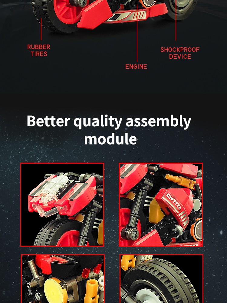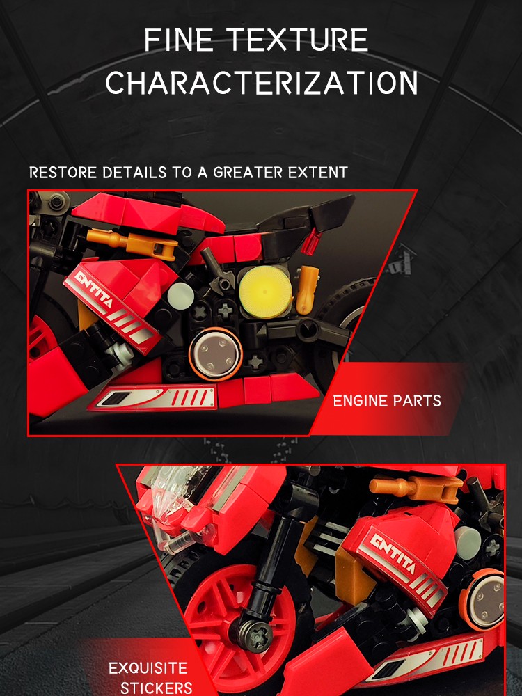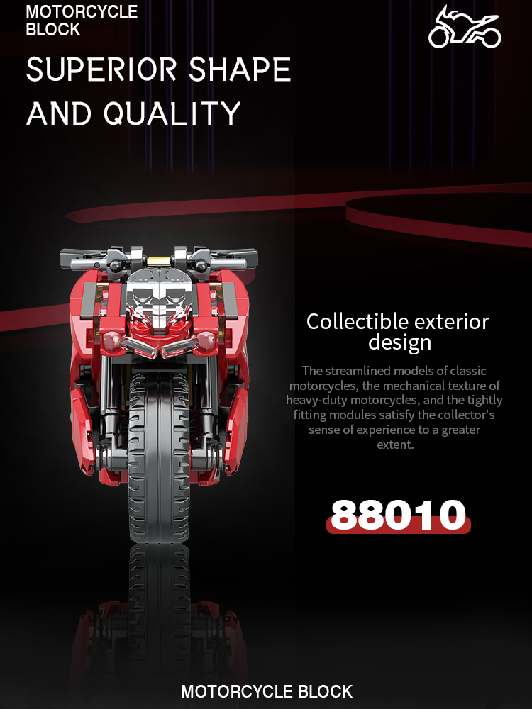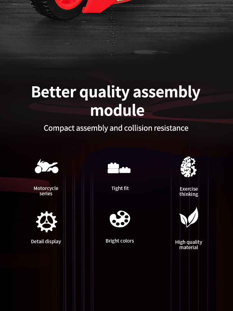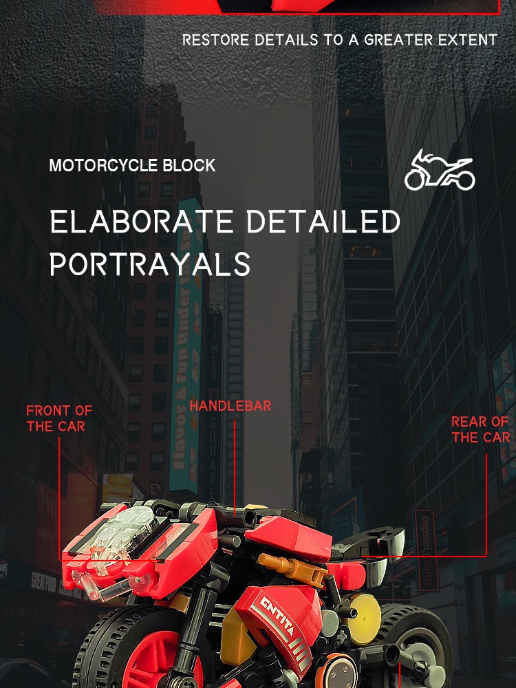 炫酷摩托车造型,精细复刻摩托车的流线型车身特征,车头、车轮等丰富细节,增强趣味性和可玩性,让玩家在动手组装的过程中,仿佛置身于机械世界的魅力之中。