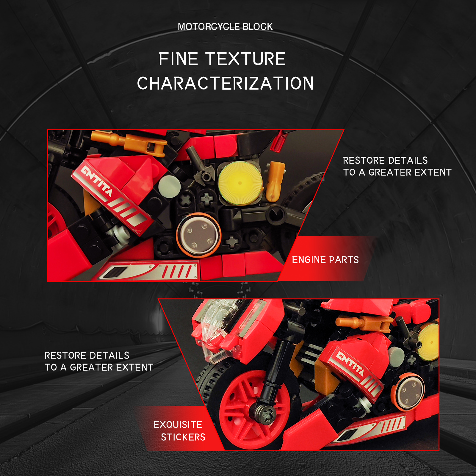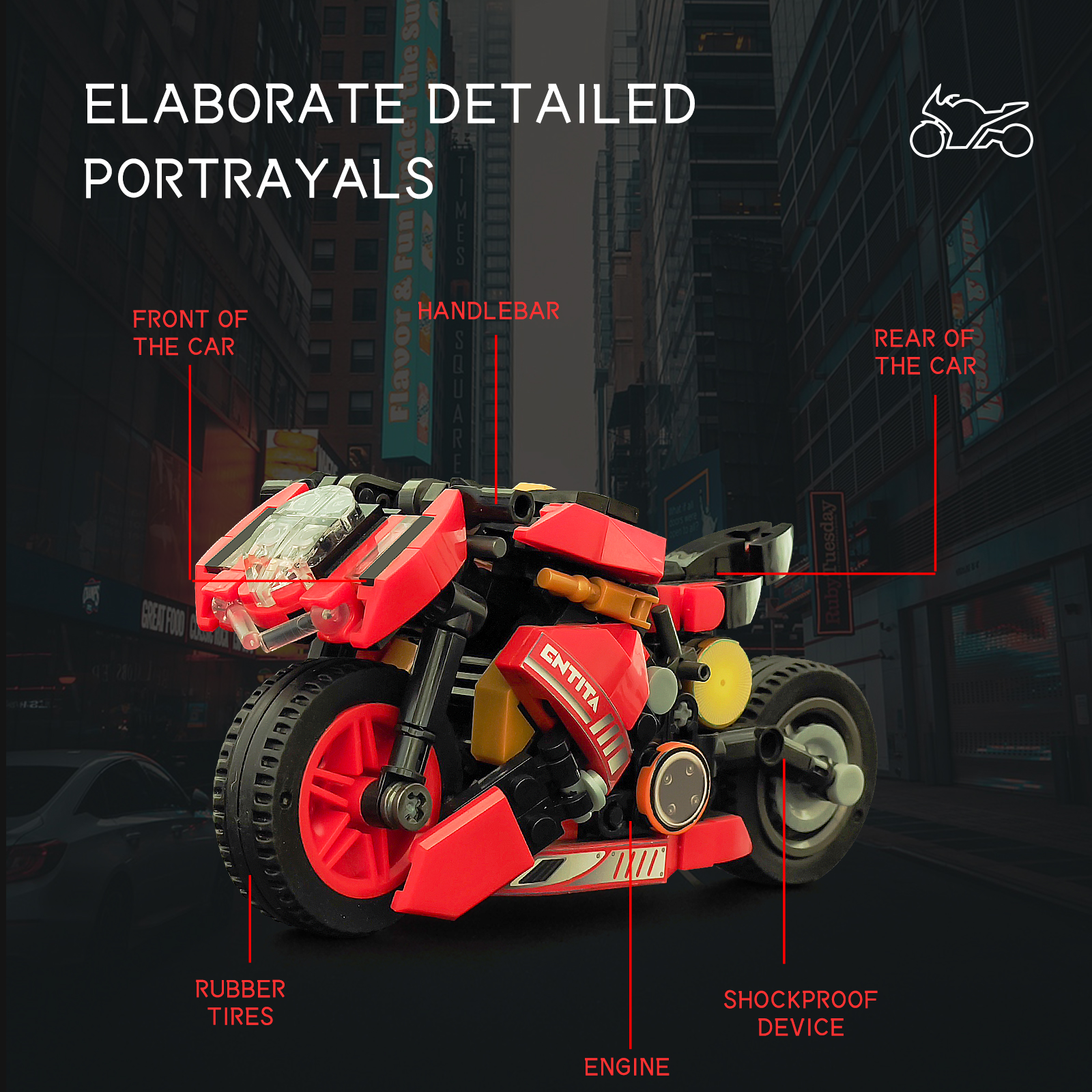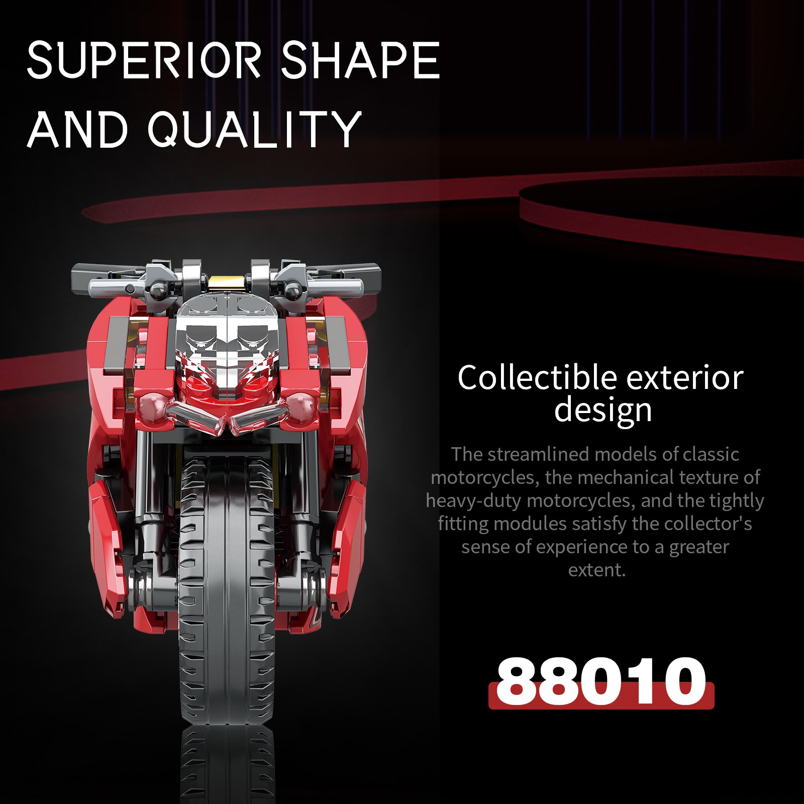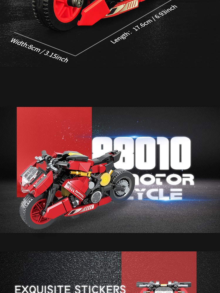 炫酷摩托车造型,精细复刻摩托车的流线型车身特征,车头、车轮等丰富细节,增强趣味性和可玩性,让玩家在动手组装的过程中,仿佛置身于机械世界的魅力之中。
