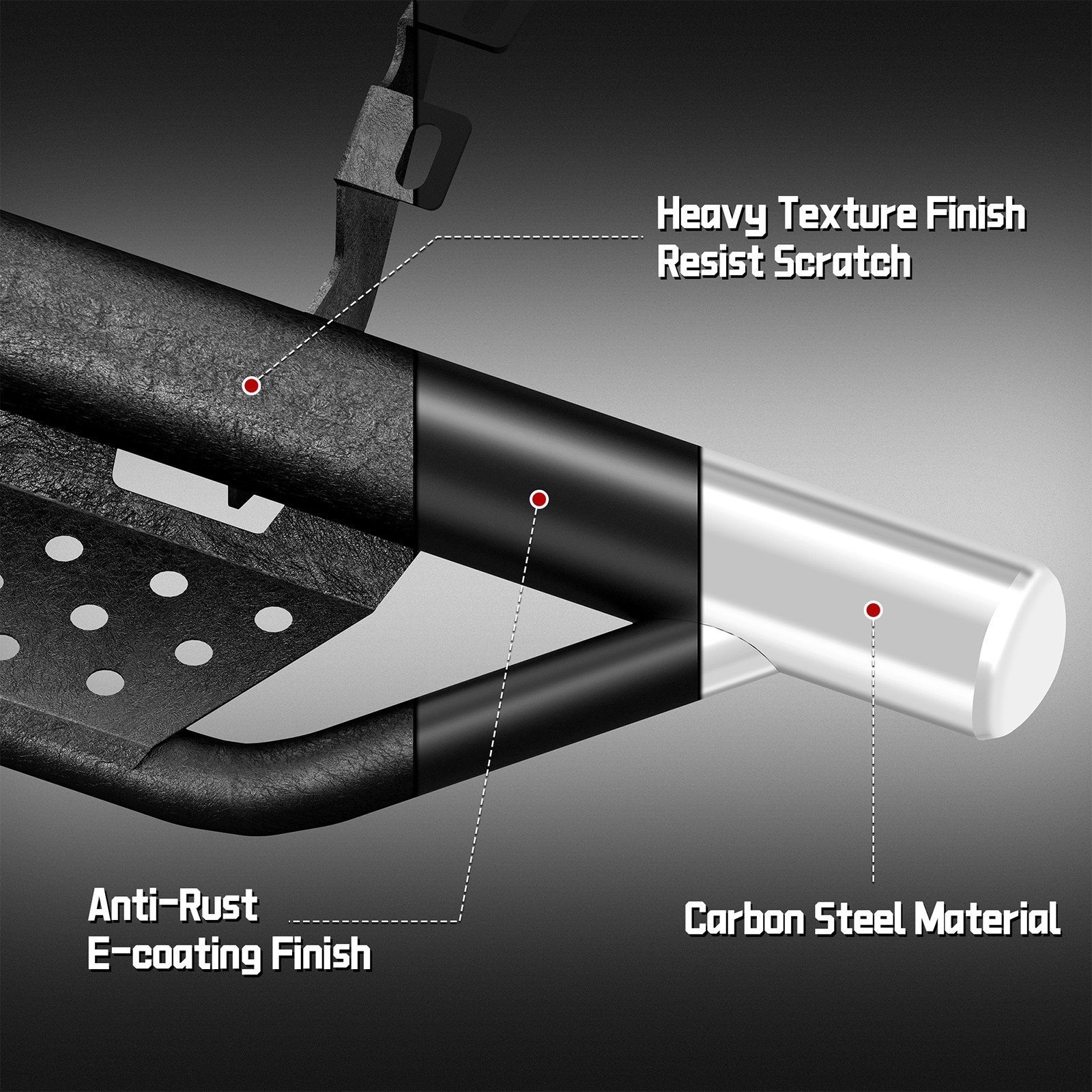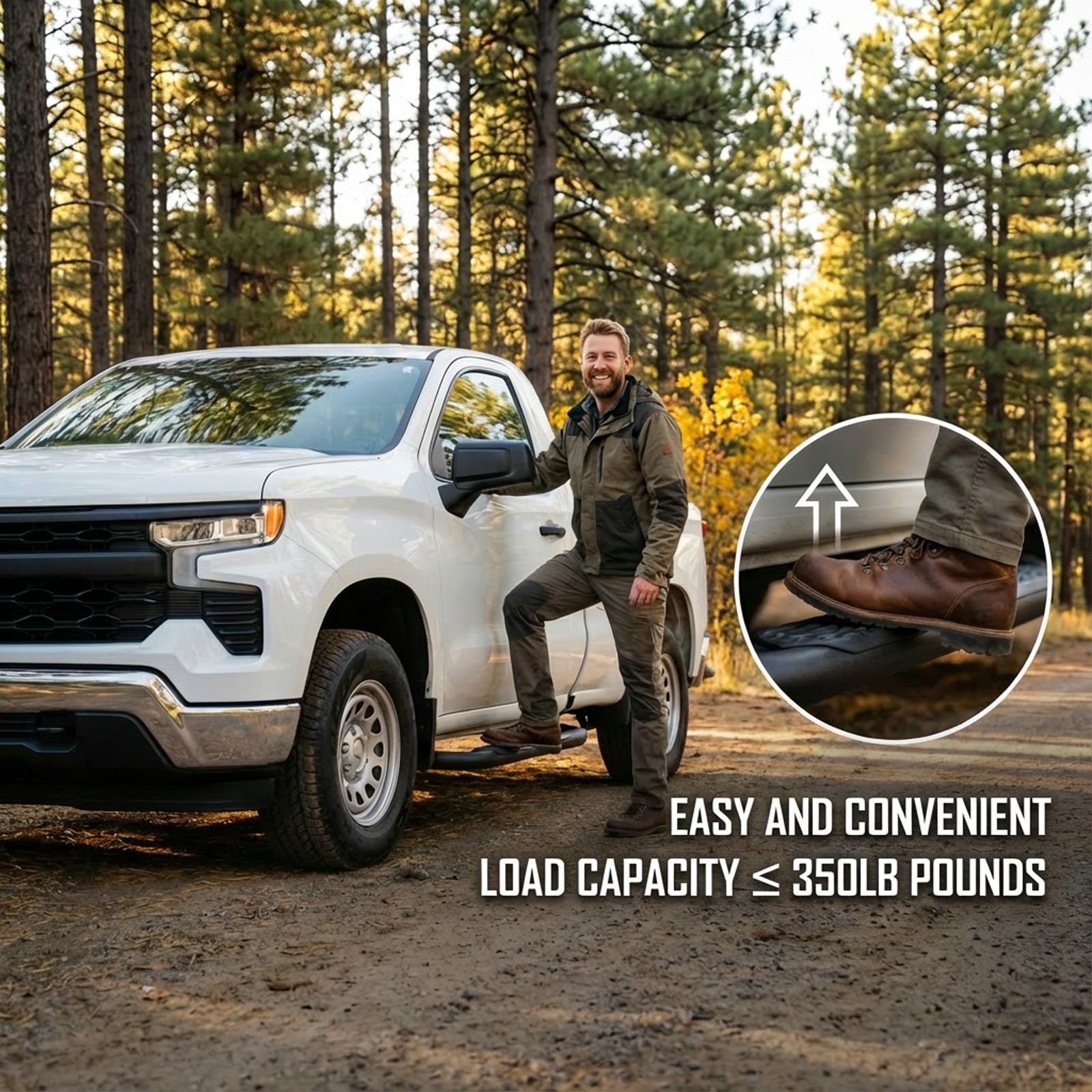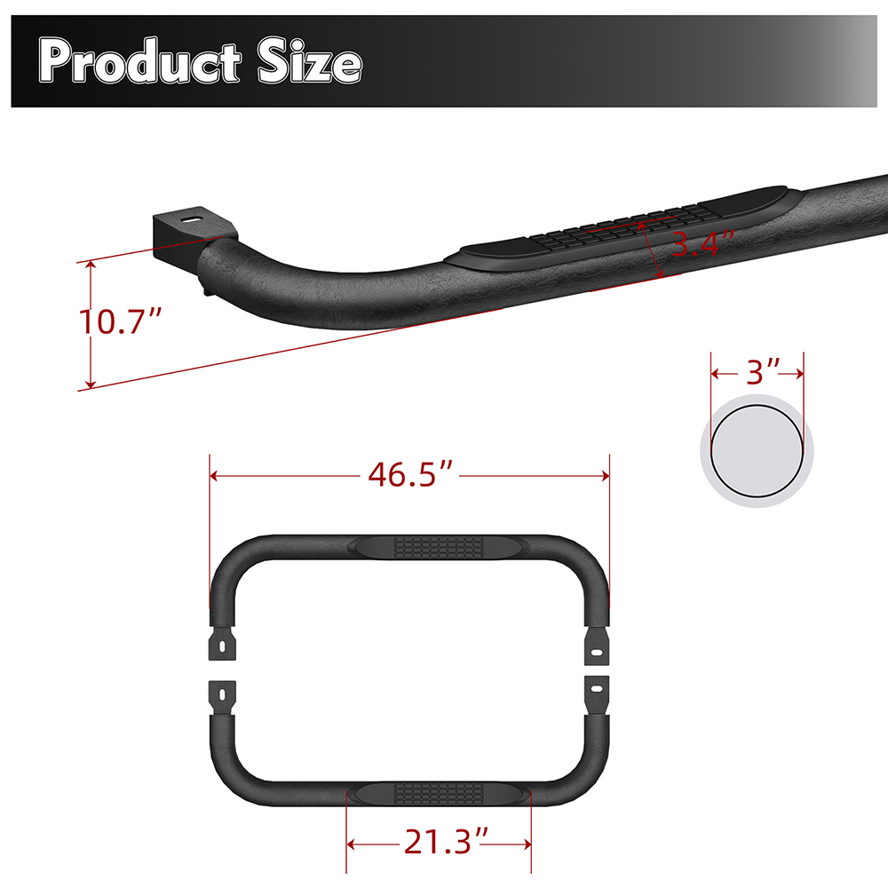 产品信息: 类型:踏板 颜色:黑色 材质:碳钢 外观处理:粉末涂层 汽车适配类型:车辆专用适配 物品重量:19.92磅 商品尺寸(长 x 宽 x 高):47.70 x 10.70 x 3.4 英寸 产品尺寸:47.60 x 12.20 x 7.1 英寸 适用车型:仅限 1999-2018 款雪佛兰 Silverado 1500/2500HD/3500HD 标准驾驶室车型(两门) 仅适用于 1999-2018 款 GMC Sierra 1500、2500HD 和 3500HD 标准驾驶室车型(两门版) 车辆位置:左侧、右侧 产品包装: 2 x 侧踏板/防撞杆/脚踏板(驾驶员侧/乘客侧) 1 x DIY安装手册 1 x 所有配件套装 适用范围: 仅适用于 1999-2018 款雪佛兰 Silverado 1500、2500HD 和 3500HD 标准驾驶室车型(双门) 仅适用于 1999-2018 款 GMC Sierra 1500、2500HD 和 3500HD 标准驾驶室车型(双门) 请在下单前查看商品图片,图片显示了驾驶室尺寸。 (购买前请仔细核对。) 适用车型: 适用于 1999-2018 款雪佛兰 Silverado 和 GMC Sierra 1500/2500 HD/3500 HD - 标准/常规驾驶室 - 仅限两门车型 请在订购前查看商品图片中的驾驶室尺寸。 (请在购买前仔细核对。) 尊敬的买家和朋友们,请注意: 1. 本产品全新未使用,未开封,无任何损坏,并附带原包装。 2. [完美贴合] - 定制的一体式设计确保牢固贴合。 3. [产品特点] 坚固耐用,独特的粉末涂层工艺提供卓越的防锈和防腐蚀性能,让您在任何条件下都能安心驾驶。激光切割踏板表面防滑,抓地力强,可承受高达 350 磅的重量而不弯曲。 3.5 英寸侧门槛采用两级踏板设计,为配备升高套件和超大轮胎的车辆提供更便捷的上下车体验。三管式设计为车辆底部和侧面提供更佳保护,并防止被侧裙板或悬挂障碍物钩住。 3.【螺栓安装】焊接支架提供额外强度,包装内含 2 根加强杆、一套支架和五金件;附带 DIY 安装说明书,无需切割或钻孔,20 分钟即可完成安装。 4.【便捷服务及注意事项】支架未预先焊接在踏板上!请放心购买!订购前请务必查看产品图片中的驾驶室尺寸。 5. 如果您不确定您的车辆是否与我们的产品兼容,或者您的产品存在任何问题(缺陷、损坏),请通过消息联系我们。我们将协助您解决任何问题,并在收到您的回复后予以确认! 6. 为了您的安全,我们建议您联系专业人员进行安装。