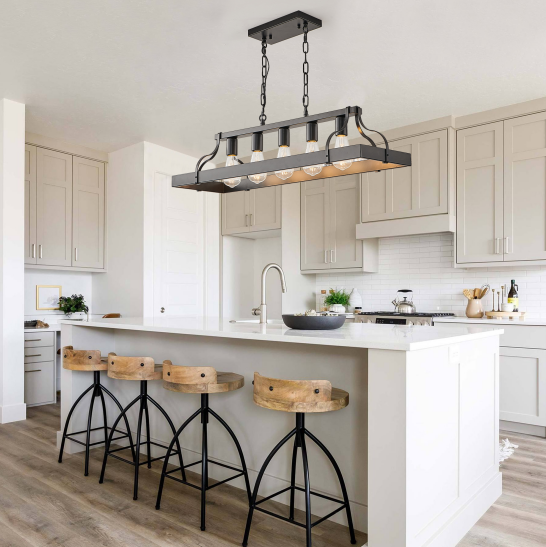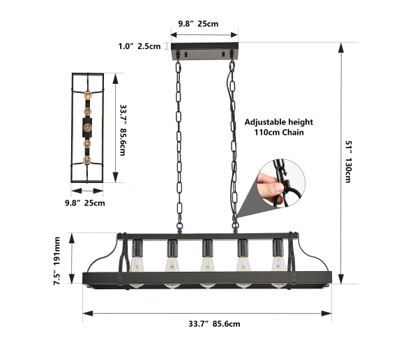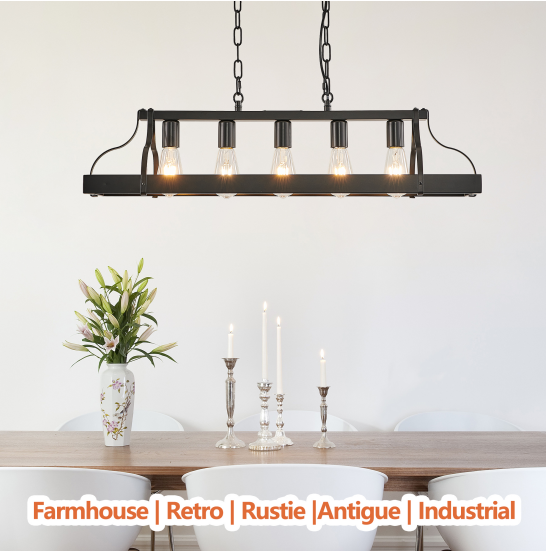 材质:铁 颜色:黑色 灯泡类型与数量:5个E26灯泡(灯泡不包含在内) 适用空间:厨房岛台、餐厅或客厅 安装方式:天花板 供电方式:硬接线 功率:每灯泡最大60瓦 电压:110-120伏