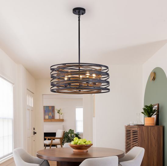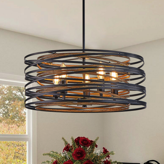 材质:铁 颜色:黑色与胡桃木色 灯泡类型与数量:5个E12灯泡(灯泡不包含在内) 适用空间:客厅、餐厅和厨房岛台 安装方式:天花板安装 供电方式:硬接线 功率:每灯泡最大60瓦 电压:110-120伏