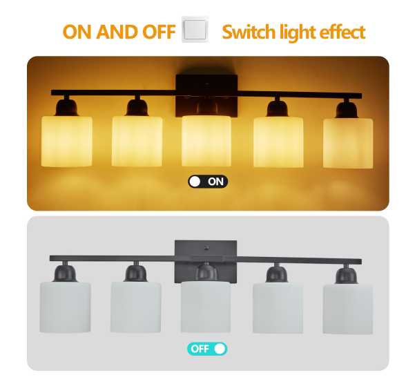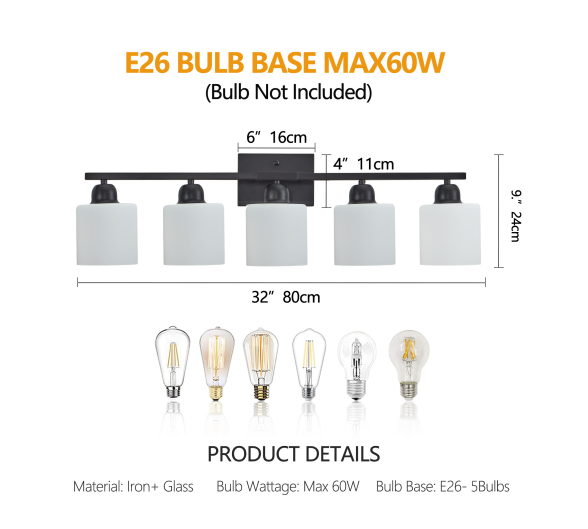 材質: 鉄とガラスの色: 黒色白色、電球タイプと数量: e26電球5個 (製品に電球は含まれていません!) を参照してください適用スペース: 浴室、更衣室など、設置方式: 壁掛け式電源方式: ハード配線電力: 電球あたり最大60ワット、電圧: 110-120ボルト