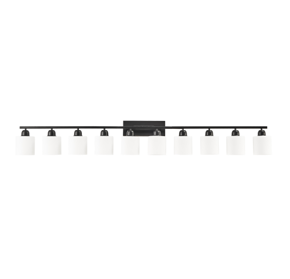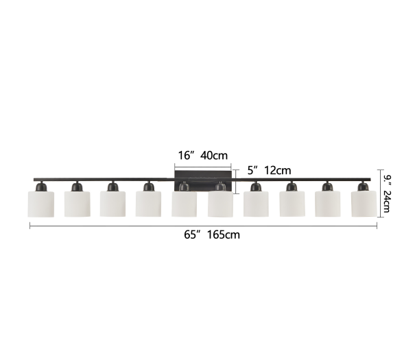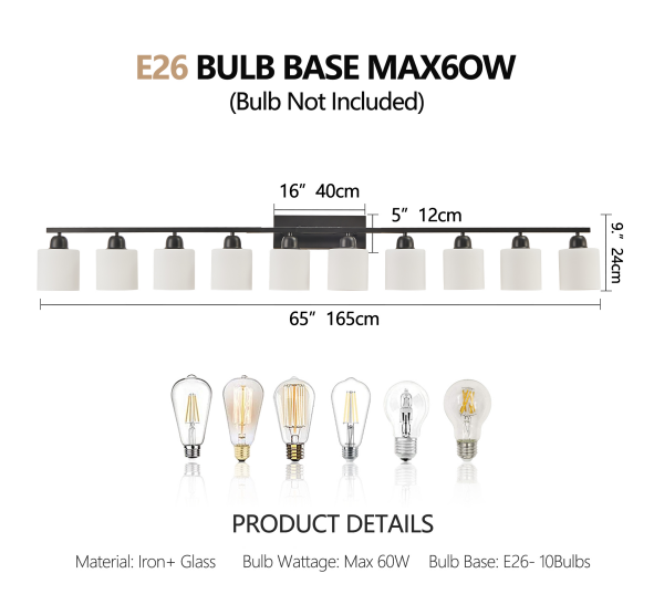 Material: iron and glass color: black, bulb type and quantity: 10 E26 bulbs (products do not include bulbs!) Applicable space: bathroom, dressing room, etc. Installation mode: wall-mounted type, power supply mode: hard wiring, Power: 60W maximum for each bulb, voltage: 110-120V