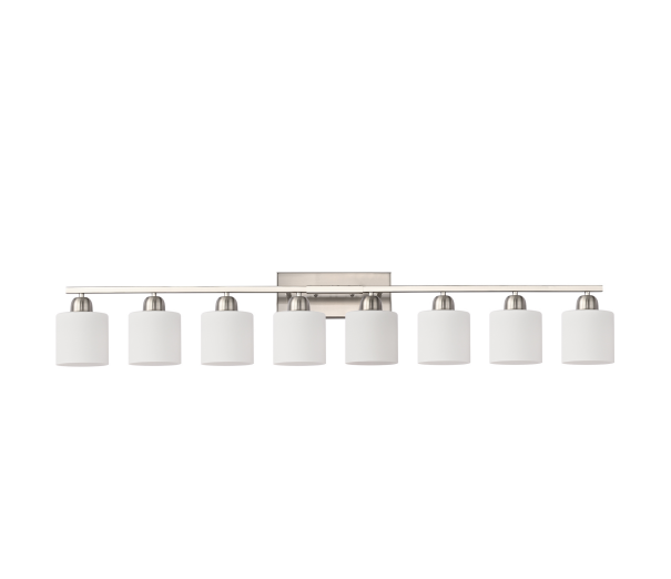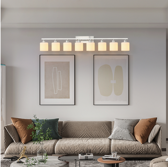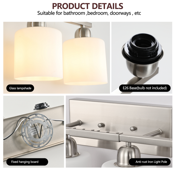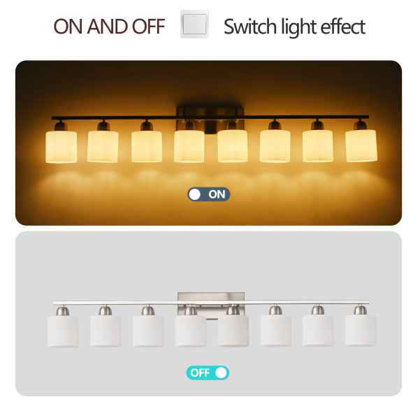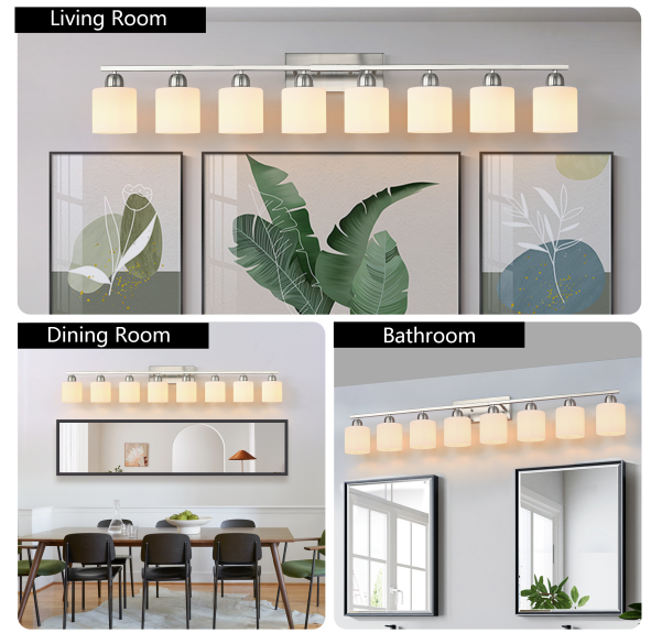 Material: iron and glass color: nickel color, bulb type and quantity: 8 E26 bulbs (products do not include bulbs!), Applicable space: bathroom, dressing room, etc. Installation mode: wall-mounted, power supply mode: hard wiring, Power: 60W maximum for each bulb, voltage: 110-120V