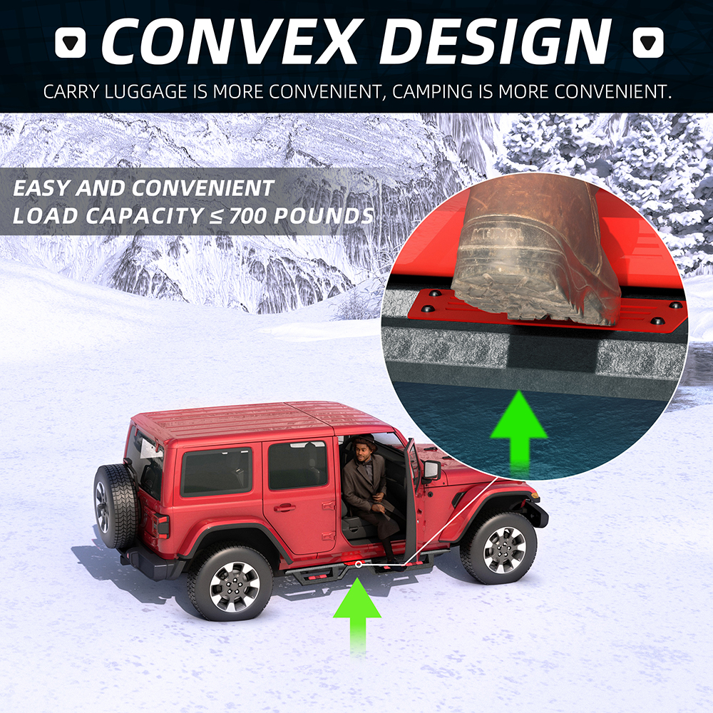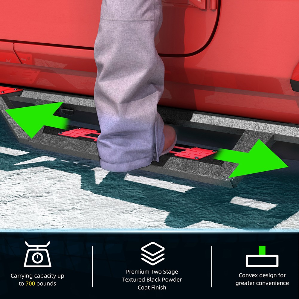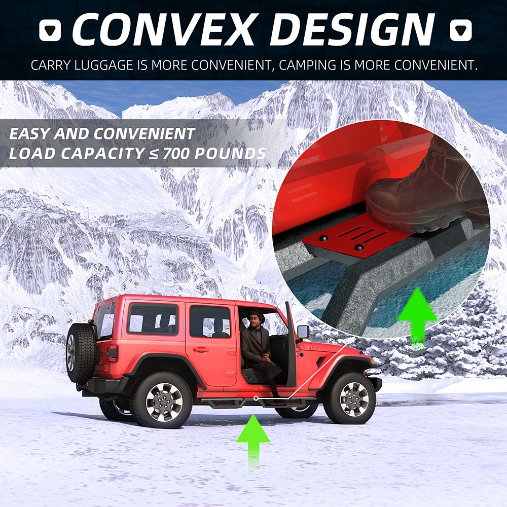 兼容性和独特设计:我们的侧踏板完美适用于 2018-2026 款 Jeep Wrangler JL 四门车型。它们与您的车辆无缝集成,提升车辆的外观和功能。 安装简便:踏板配有焊接支架,更加坚固稳定。安装快捷方便,只需少量配件,无需切割或钻孔。功能便捷:采用双层踏板设计,方便加装举升套件和超大尺寸轮胎的车辆轻松上下车,使屋顶作业更加顺畅便捷。 坚固耐用:我们的踏板经久耐用,采用独特的粉末涂层,防锈防腐蚀。激光切割的踏板表面防滑,抓地力强,可承重高达 700 磅(约 318 公斤)而不弯曲。 无忧服务及注意事项:我们始终将客户满意度放在首位。请注意,支架并未预先焊接在踏板上,以便安装时可根据实际情况进行调整。为确保安全,建议由专业人员进行安装。 提示:包装盒内含一套蓝色踏板装饰件,可自行更换。 产品信息: 颜色:黑色/红色/蓝色 材质:重型碳钢 外表面处理:粉末涂层 物品重量:53.50磅 包装尺寸:72.80 x 12 x 7 英寸 汽车适配类型:车辆专用适配 商品型号:Wrangler JL踏板 车辆服务类型:适用于 2018-2026 款 Jeep Wrangler JL 四门车型。 车辆位置:左侧、右侧 产品包装: 2 个侧踏板(驾驶员侧和乘客侧) 1 x DIY安装手册 1 x 所有配件套装 双色布贴(红色和蓝色) 适用范围: 适用于 2018-2026 款 Jeep Wrangler JL 四门车型。 请在下单前查看商品图片,图片显示了驾驶室尺寸。 (购买前请仔细核对。) 【产品特点】 坚固耐用,独特的粉末涂层工艺提供卓越的防锈和防腐蚀性能,让您在任何条件下都能安心驾驶。激光切割的踏板表面防滑,抓地力更强,可承受高达 700 磅的重量而不弯曲。 侧裙采用两级台阶设计,为配备升高套件和超大轮胎的车辆提供更好的便利性;三管式设计为车辆底部和侧面提供更多保护,并防止被侧裙板或悬架障碍物钩住。